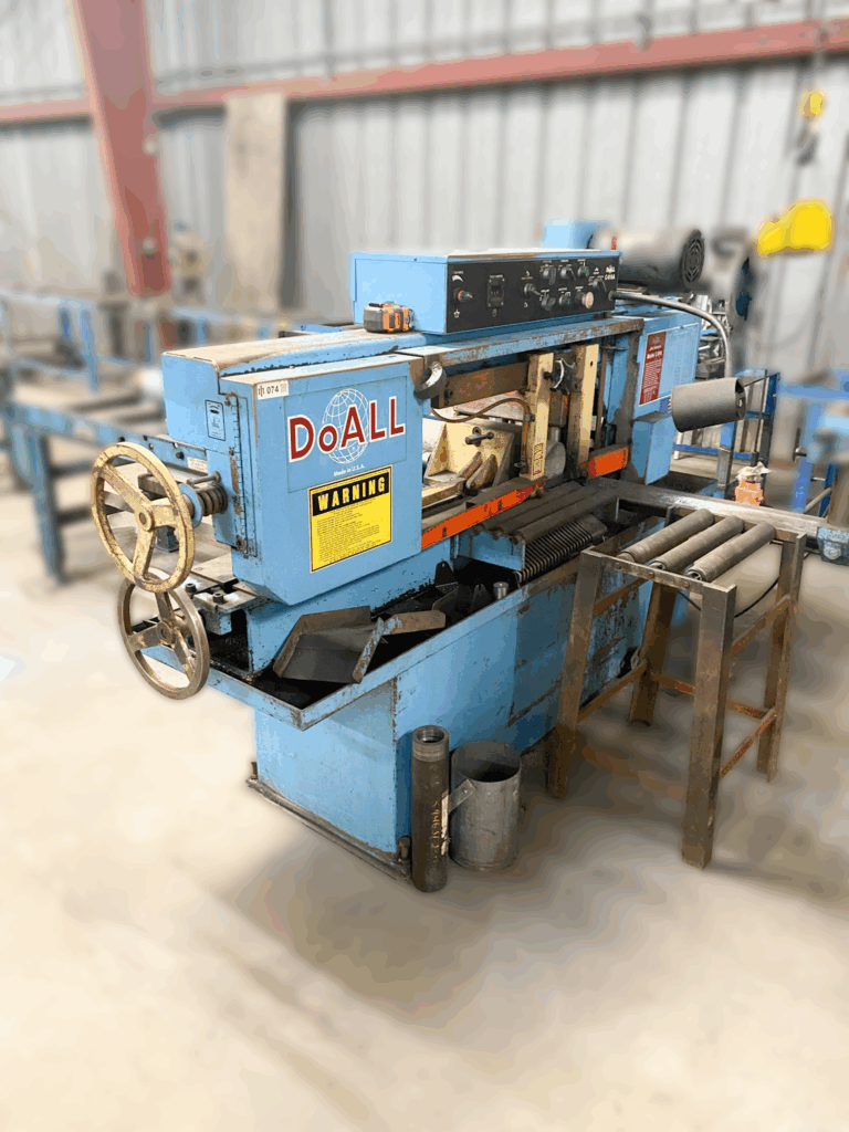 This semiautomated band saw is designed to cut any shape of raw stock material. Used in the fabrication of metal structures, signage framework, decorative post and custom entryway gates.